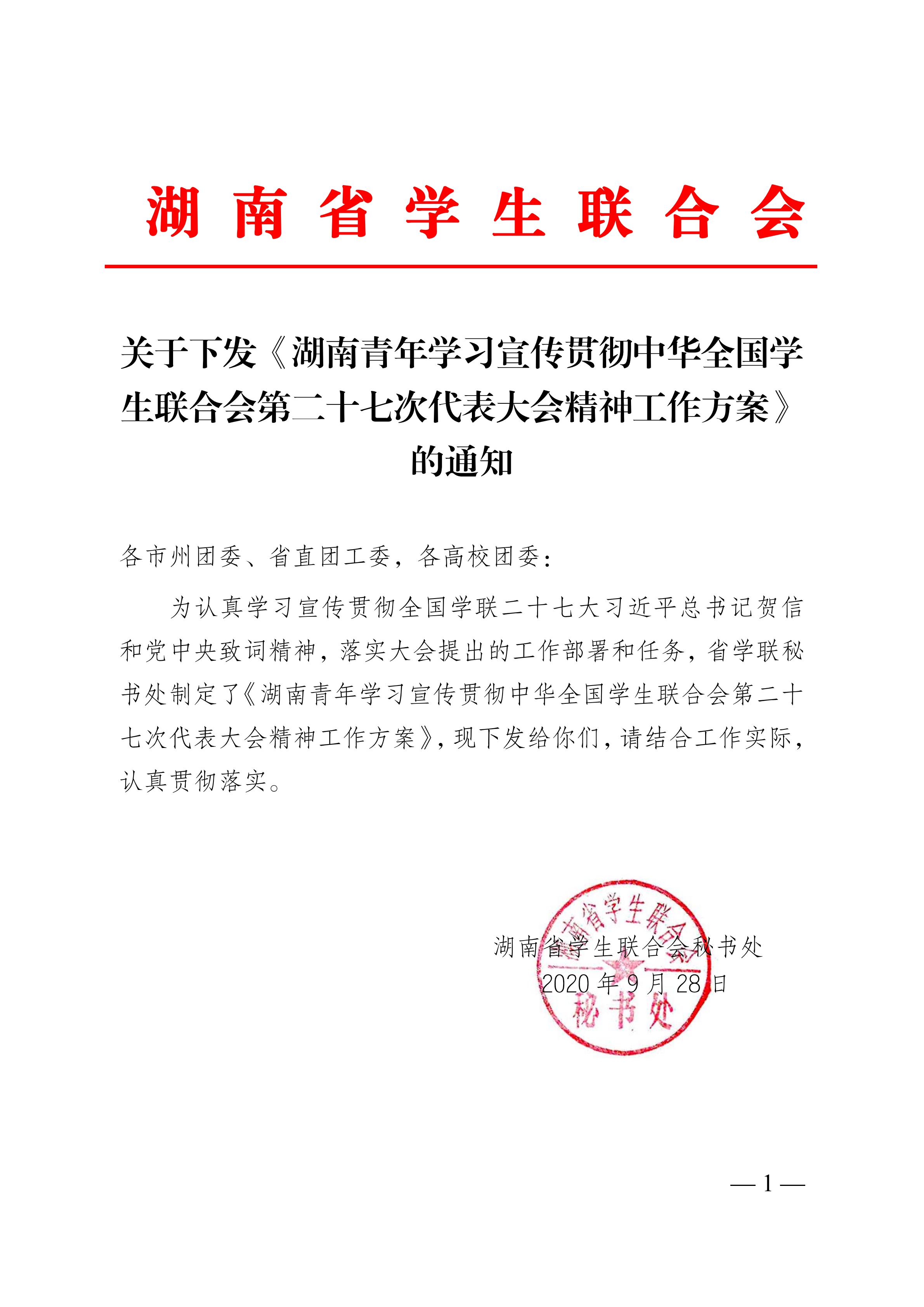 通知:请院团委、学生会、各系部团总支按照湖南省学生联合会下发的,关于下发《湖南青年学习宣传贯彻中华全国学生联合会第二十七次代表大会精神工作方案》的通知要求,下载下方附件组织进行学习。