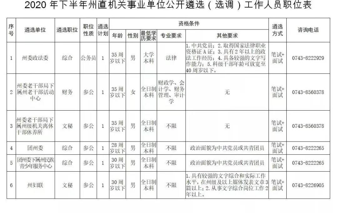 为加强州直机关事业单位干部队伍建设,根据《公务员公开遴选办法(试行)》(中组发〔2013〕3号)、《湖南省公务员公开遴选办法(试行)》(湘人社发〔2016〕14号)、《湘西自治州州直机关公务员公开遴选实施办法(试行)》(州组通〔2017〕6号)等有关规定,州委组织部、州委编办、州人社局决定开展2020年下半年州直机关事业单位(含参照公务员法管理单位)公开遴选(选调)工作人员工作。现将有关事项公告如下: