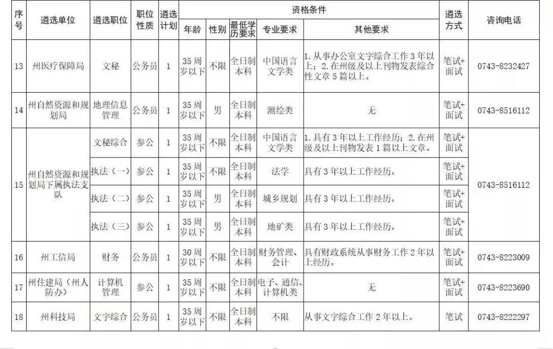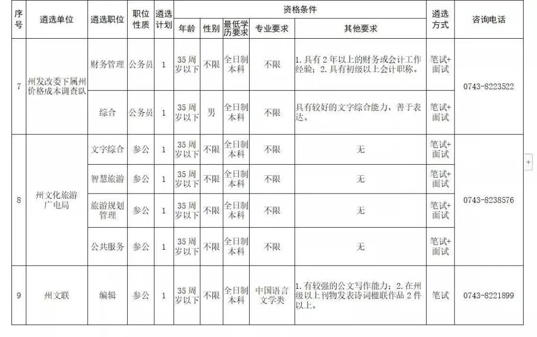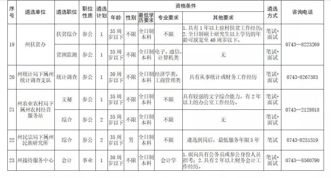 报考公务员、参照公务员法管理单位相关职位的需为全州已进行公务员(参公)登记、在编在岗的公务员或参照公务员法管理单位工作人员(个别面向全国遴选的岗位同样需为已进行公务员(参公)登记、在编在岗的公务员或参照公务员法管理单位工作人员)。报考事业单位相关职位的具体要求见职位表。