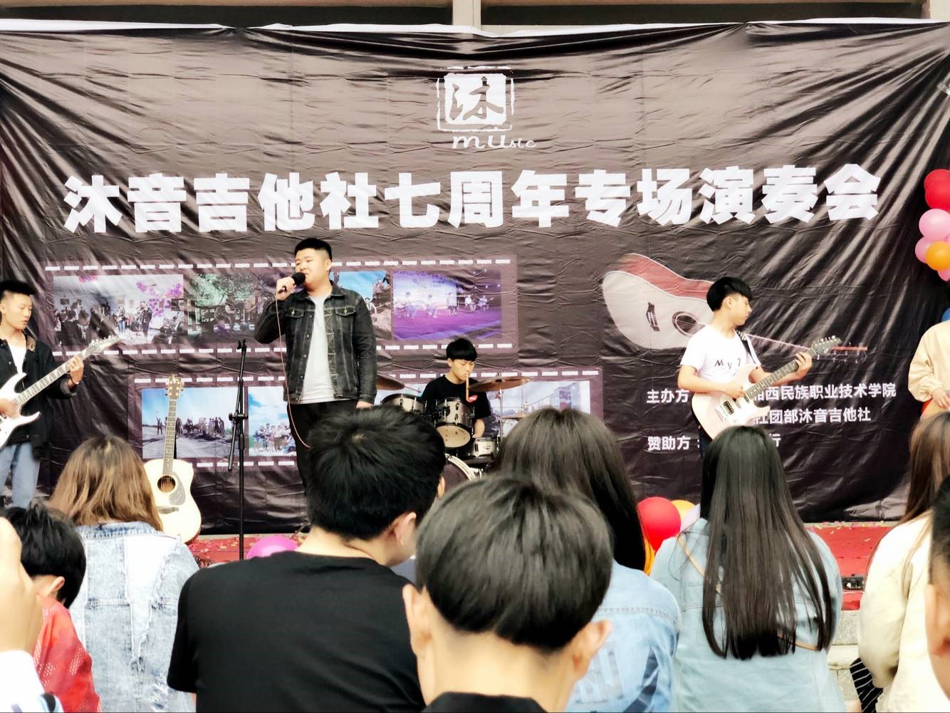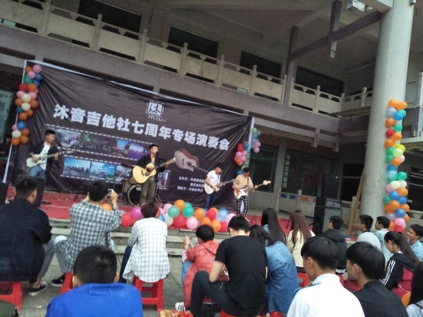 为丰富我院校园生活,促进同学们才学共进,推广音乐文化,我院沐音吉他社于2018年5月4日在学院商务中心前举行七周年庆祝活动。本次活动由沐音吉他社团队主办,参加本次活动的有社团全体成员和来自我院各系部的音乐爱好者。