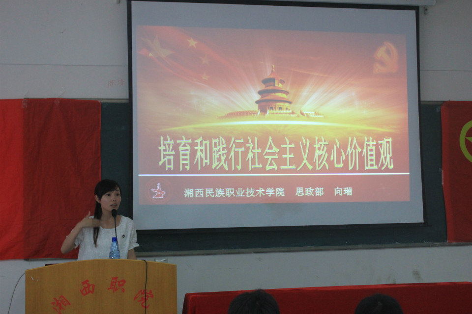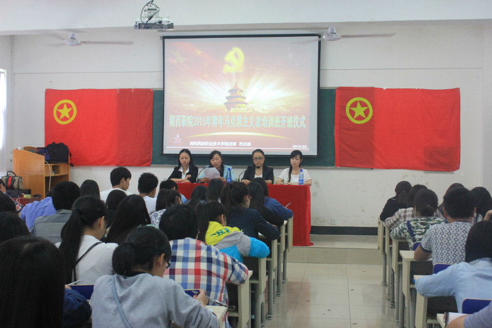 开班仪式上,院团委负责人王丹子宣读了《湘西职院青年马克思主义者培养工程实施方案》,并为学院青年马克思主义者培训班授旗;思政部主任熊谟菊对本次培训班开班表示热烈的祝贺,希望同学们能学有所悟、学有所成、学有所获,从而成长为中国特色社会主义事业的合格建设者和可靠接班人打下坚实的基础。随后,思政部优秀青年教师向瑞为同学们带来了以“培养和践行社会主义核心价值观”为主题的精彩讲课。
