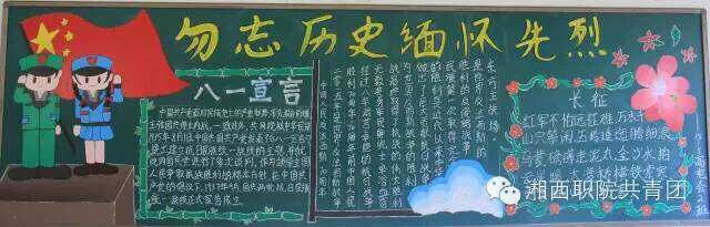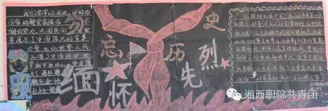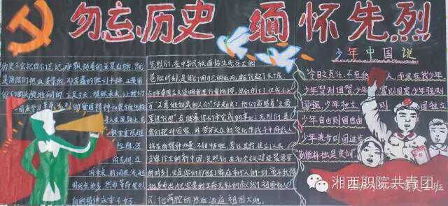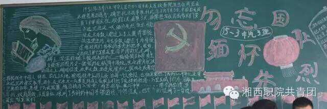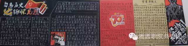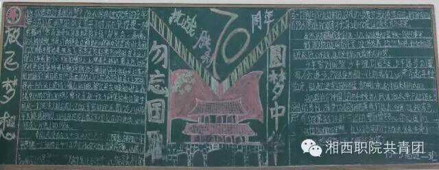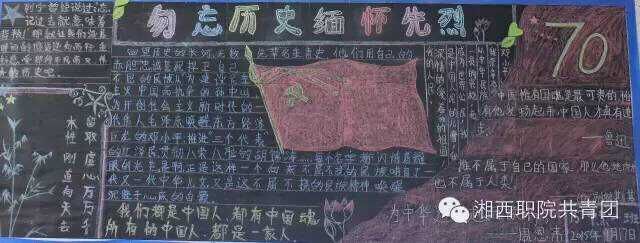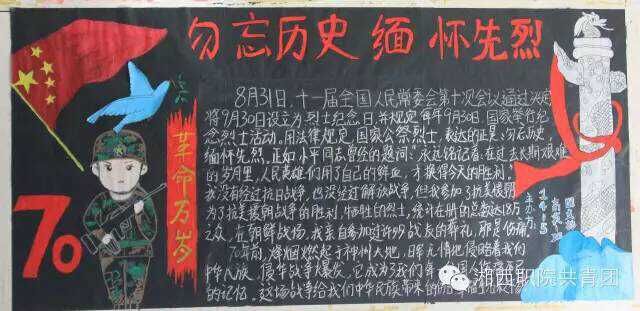 为纪念抗战胜利暨世界反法西斯战争胜利70周年,弘扬民族精神和爱国主义精神,培育和践行社会主义核心价值观,学院于9月举办了以“勿忘历史、缅怀先烈”为主题的黑板报比赛,用黑板报的形式表达爱国之心、强国之愿、报国之志。通过此次活动的开展,让学生们进一步了解抗日战争历史,对抗日英雄燃起了敬畏之情,对来之不易的幸福生活倍加珍惜。