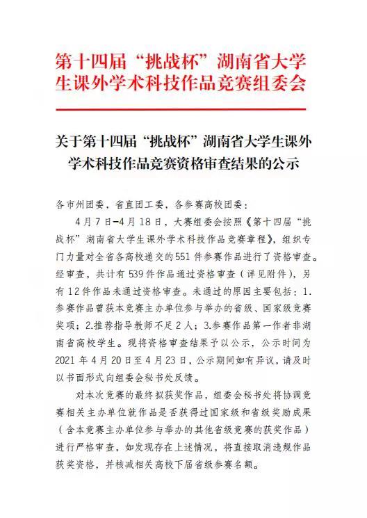 关于第十四届“挑战杯”湖南省大学生课外 学术科技作品竞赛资格审查结果的公示