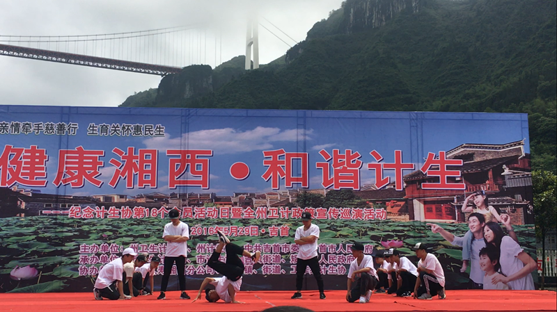 2016年5月29日上午,由州卫计委、州计生局、吉首市委、市政府主办的“健康湘西·和谐计生”——纪念计生协第18个会员活动日暨全州卫计政策宣传巡演活动在吉首市矮寨小学隆重举行。我院soul街舞协会受吉凤街道的邀请参加了本次文艺演出活动。州、市计生协领导与协会会员、贫困母亲及受助留守儿童代表及附近群众近千人一道观看了演出。