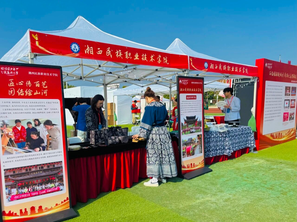 在精心布置的展示区域内,我校展示了富有湘西特色的土家族、苗族非遗工艺作品、独具风味的民族美食等,生动呈现了我校以铸牢中华民族共同体意识为主线推动人才培养工作取得的系列成果。刚柔并济的苗鼓表演、土家织锦的古朴纹样、苗绣蜡染的独特工艺以及滋味独特的风味美食吸引了大量参展者驻足观看、互动体验。活动期间,隋忠诚、虢正贵等领导嘉宾来到我校展台,听取了现场师生关于展示内容与教育成果的介绍,并与他们进行亲切交流。