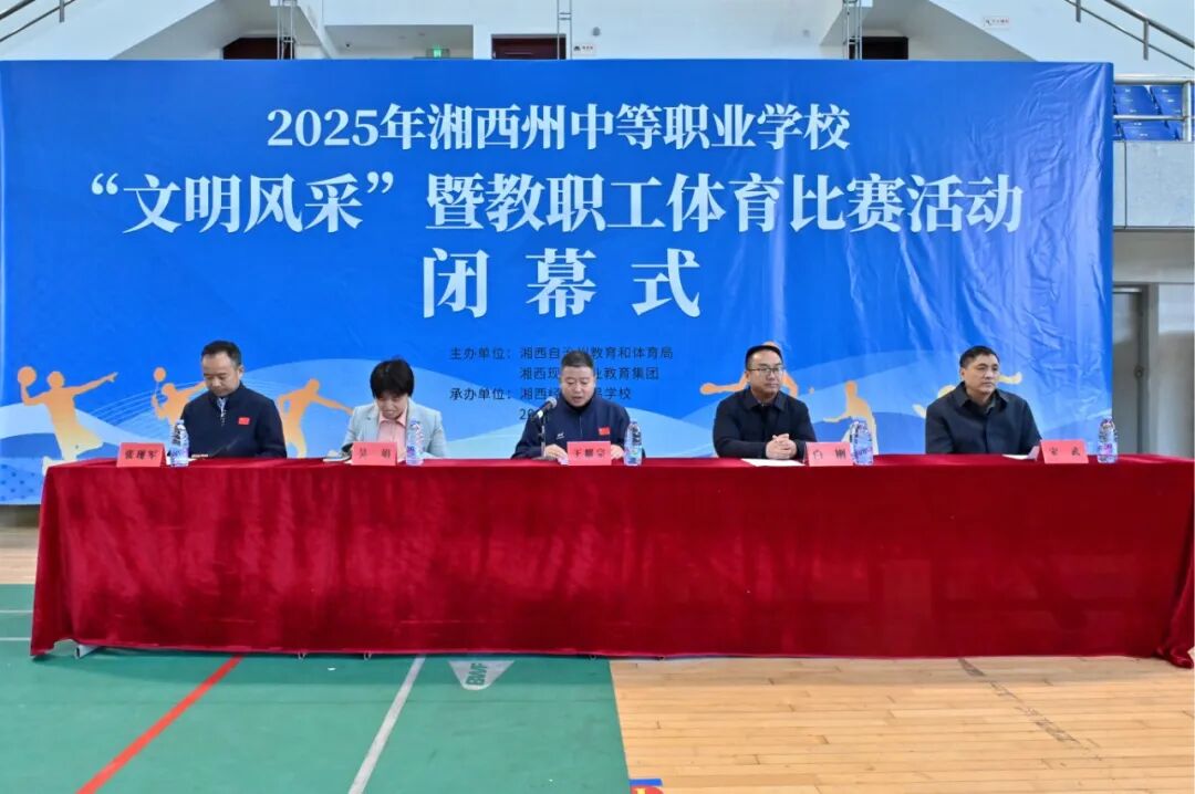 湘西州教体局党组成员、副局长、湘西现代职教集团常务副理事长王耀宗致闭幕辞。他指出,“文明风采”体育竞赛是湘西州职业教育领域的传统盛事,不仅丰富了师生体育文化生活,更成为推进校园精神文明建设、增强集体凝聚力的重要平台。他鼓励大家将赛场上的激情与拼搏精神延续到工作和学习中,为湘西州职业教育高质量发展贡献力量。