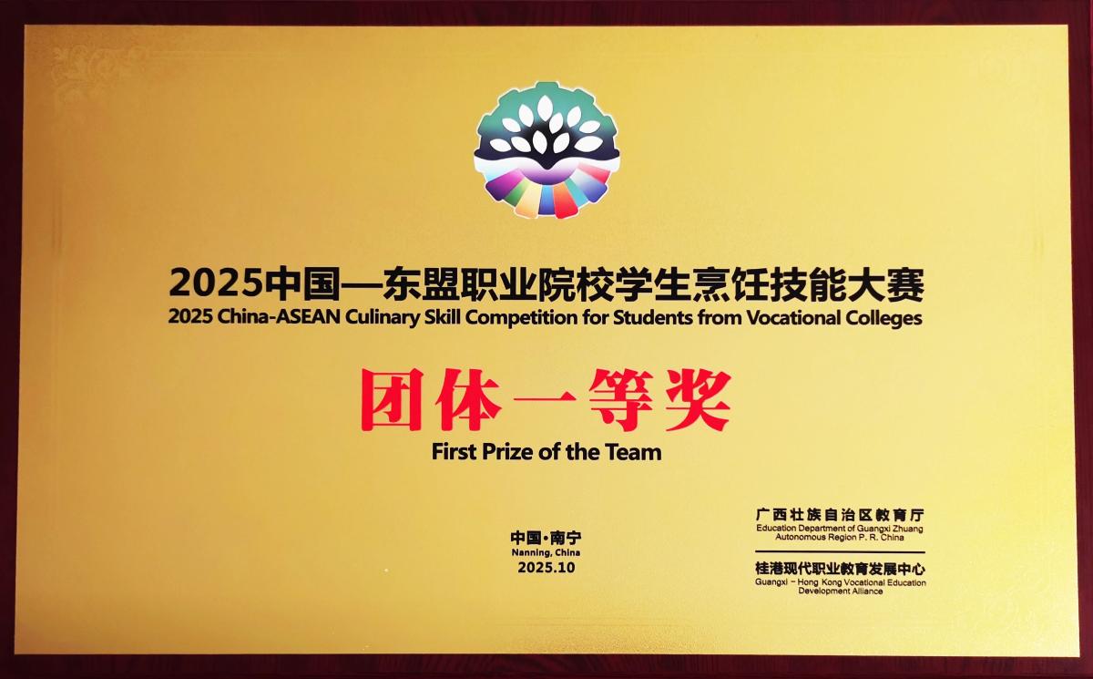 10月22日至24日,2025中国—东盟职业院校学生烹饪技能大赛在南宁职业技术大学举行。本届大赛以“技能铸就梦想,美食连接友谊”为主题,吸引了来自包括香港在内的我国11个省级行政区,以及泰国、越南、印尼、老挝等国家的共40支代表队,共同切磋交流,展示烹饪技艺与文化魅力。我校由旅游管理学院5名学生(谭家星、单嘉辉、罗佳、杨虹琳、胡雅真)组成的代表队,凭借扎实的专业功底、精湛的技艺水平和沉稳的现场表现,最终荣获大赛团体一等奖,实现了我校在该项赛事中的历史性突破。