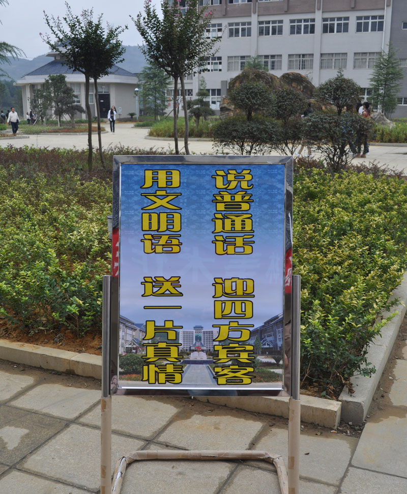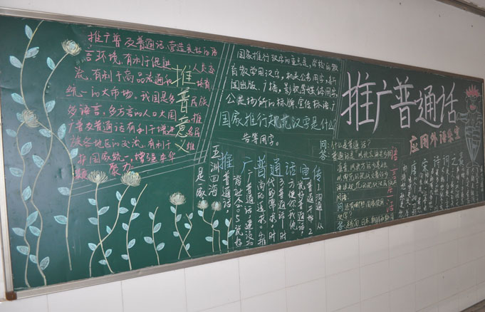 据学院“迎检”工作负责人介绍,学院领导重视语言文字规范化工作,多次组织教职员工学习《教师法》、《教育法》、《中华人民共和国通用语言文字法》等法律法规,建立相应的规章制度,把使用普通话和规范用字作为教师课堂教学、执教能力测评、晋级晋职的考核依据之一。学院7名省级普通话水平测试员不定期举办培训班,为学院师生普通话水平提质增量,近两年,学院的普通话测试达标率达92%。每年定期在“推普周”开展活动外,其他时间里,“推普”活动也是精彩纷呈,“演讲赛”、“书法赛”、“普通话比赛”等活动时常在学院内开展,应用外语系已持续四年开展了“弘扬国学传统,晨读《弟子规》”活动。学院有越来越多的人参与讲普通话、写规范字的行列当中了。