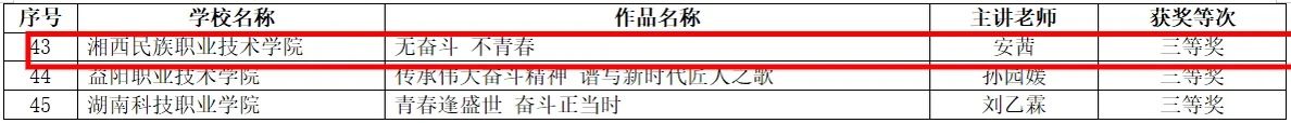 近日,湖南省教育厅公示“奋斗青春号”大思政课堂系列主题活动获奖结果,湘西民族职业技术学院老师在活动中荣获多项奖项。