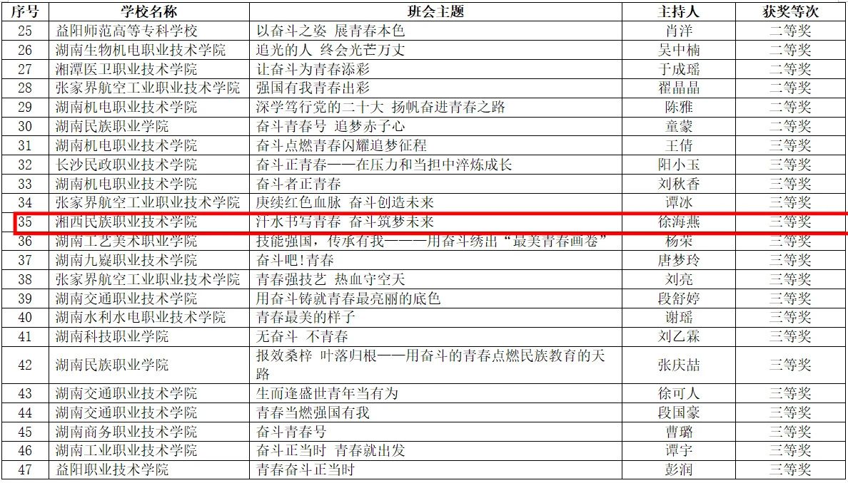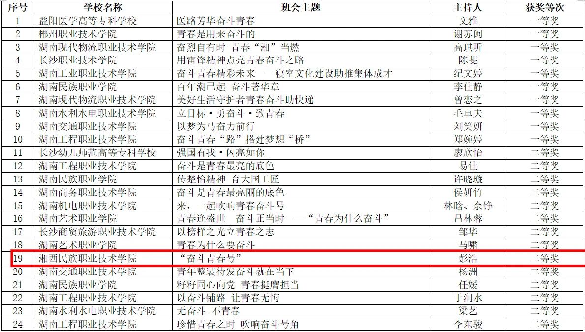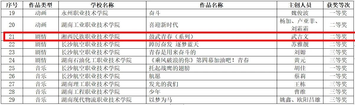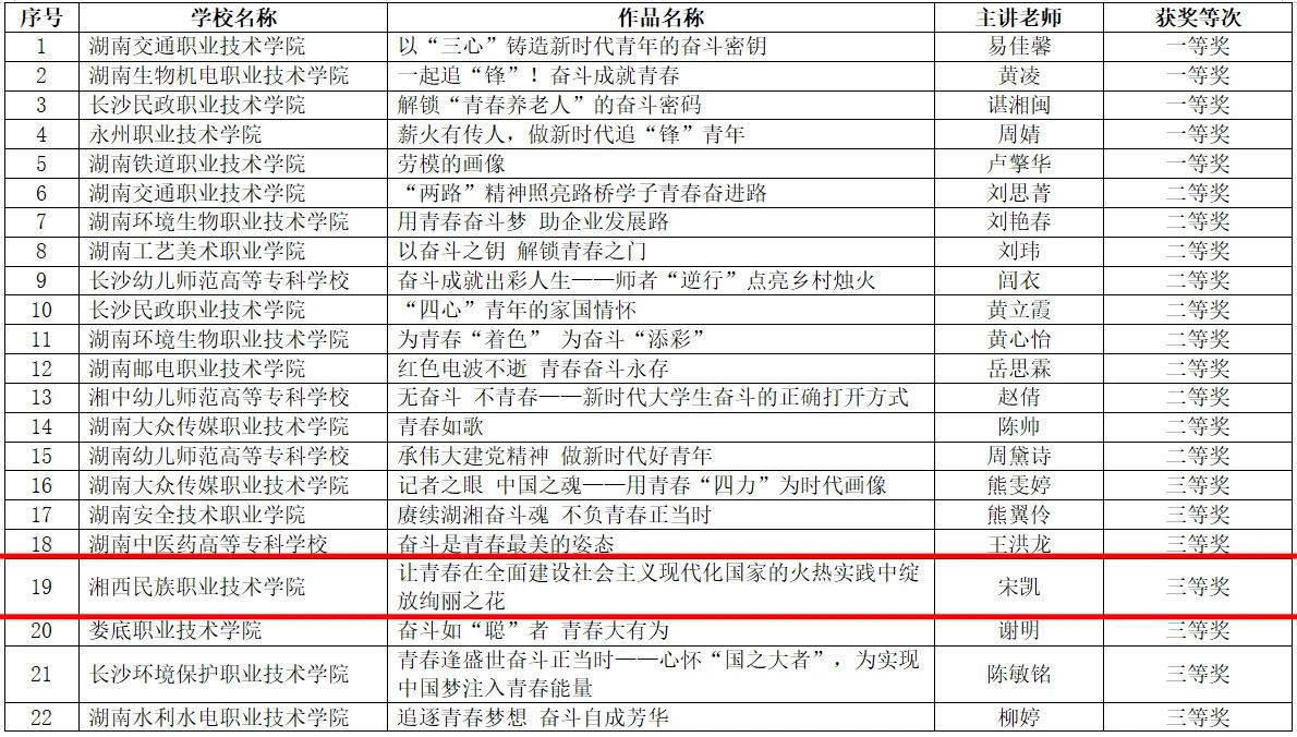 在“奋斗青春号”主题班会活动中,湘西职院彭浩《奋斗青春号》荣获二等奖,徐海燕《汗水书写青春,奋斗筑梦未来》荣获三等奖;在“奋斗青春号”微课竞赛活动中,宋凯《让青春在全面建设社会主义现代化国家的火热实践中绽放绚丽之花》荣获三等奖,安茜《无奋斗,不青春》荣获三等奖;在“奋斗青春号”视频展播活动中,武吉文《鼓武青春(系列)》荣获二等奖。