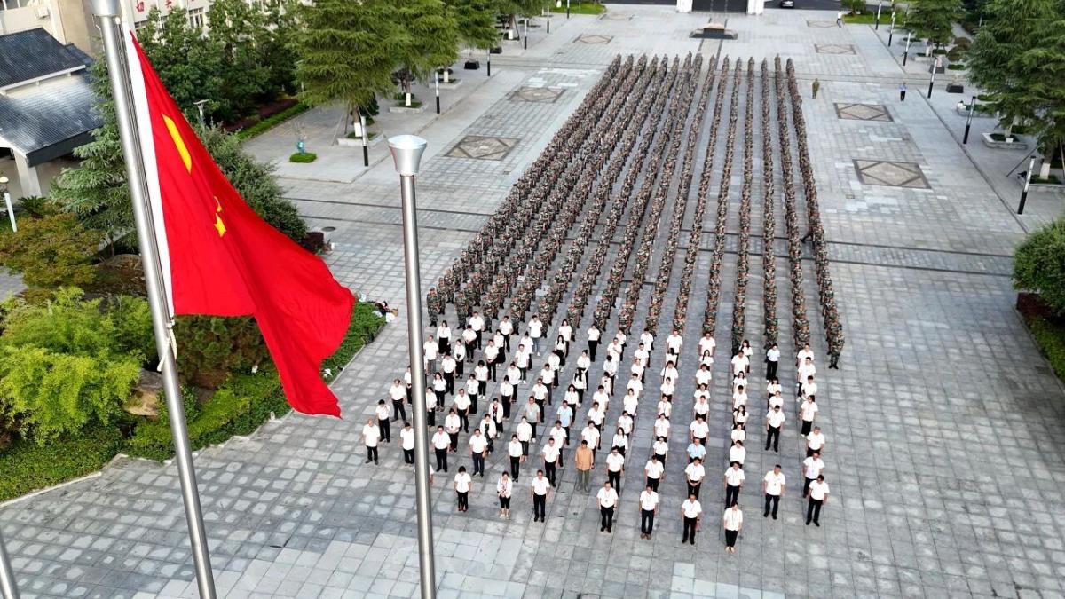 晨光中,国旗护卫队步伐铿锵,庄严护送国旗入场。伴随着激昂的国歌声,五星红旗冉冉升起,迎风飘扬。全场教师肃立行注目礼,正在参加军训的全体新生行军礼,共同见证这一神圣时刻。