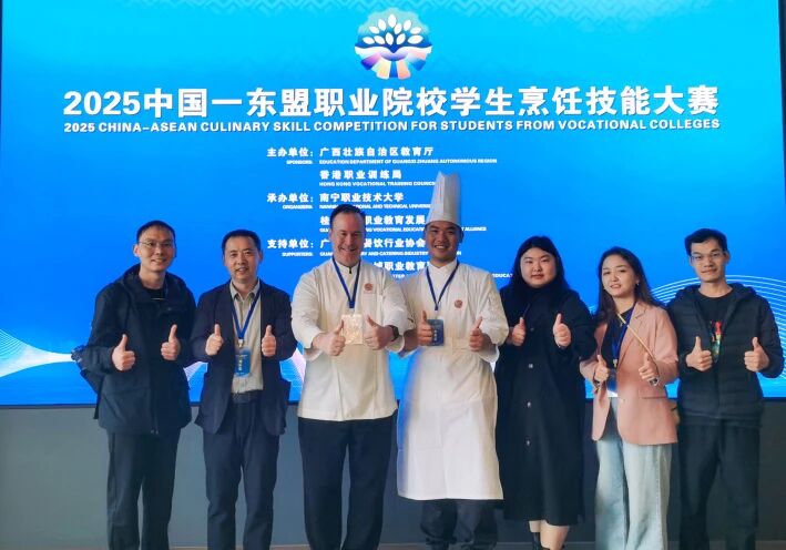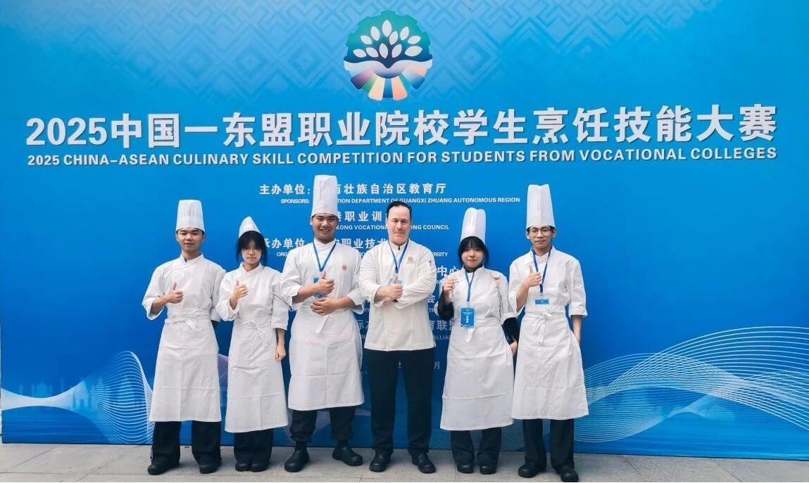 10月22日至24日,2025中国—东盟职业院校学生烹饪技能大赛在南宁职业技术大学举行。本届大赛以“技能铸就梦想,美食连接友谊”为主题,吸引了来自包括香港在内的我国11个省级行政区,以及泰国、越南、印尼、老挝等国家的共40支代表队,共同切磋交流,展示烹饪技艺与文化魅力。我校由旅游管理学院5名学生(谭家星、单嘉辉、罗佳、杨虹琳、胡雅真)组成的代表队,凭借扎实的专业功底、精湛的技艺水平和沉稳的现场表现,最终荣获大赛团体一等奖,实现了我校在该项赛事中的历史性突破。