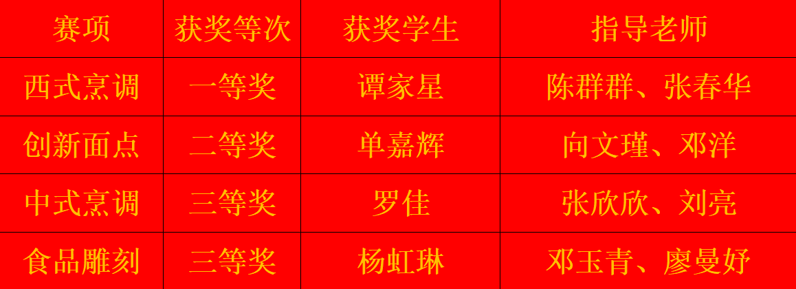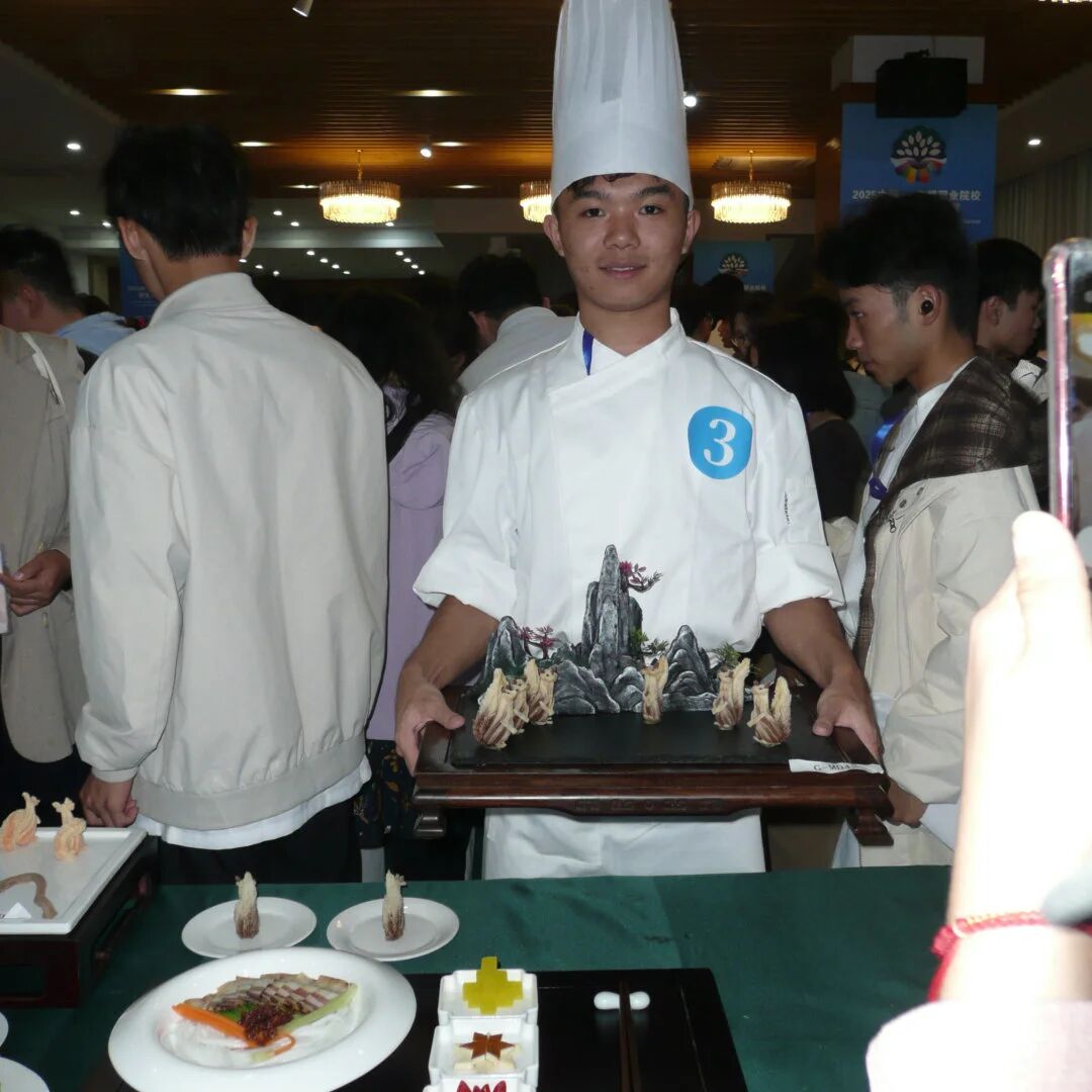 本次大赛共设中式烹调、西式烹调、食品雕刻、创新面点及糖艺造型五个赛项,全面考察选手的技艺功底、创意设计与审美素养。在我校指导教师团队的悉心指导下,参赛学子在全部赛项中均有出色发挥,荣获西式烹调一等奖、创新面点二等奖、中式烹调三等奖、食品雕刻三等奖。陈群群、张春华荣获“优秀指导教师”称号,李铁虎荣获“优秀领队”称号。