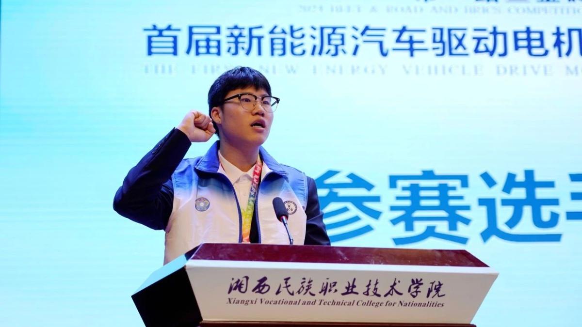11月29日,由金砖国家工商理事会(BRICS BC)、一带一路暨金砖国家技能发展国际联盟(IASDB)、教育部中外人文交流中心等单位联合主办的一带一路暨金砖国家技能发展与技术创新大赛首届新能源汽车驱动电机及控制技术(虚拟仿真)赛项在湘西民族职业技术学院开幕。金砖国家技能发展与技术创新大赛组委会执委会副主席何勇,湘西州人民政府副秘书长胡朝晖,湘西职院党委书记谢绍猛,北京智学客教育科技有限公司市场总监赵树森,湘西自治州教体局副局长王耀宗,北京企学研教育科技研究院竞赛合作处副主任张俊猛,赛项专家组组长张立荣,赛项裁判长林崟,赛项仲裁长何锡武,湘西职院在家班子成员、各部门负责人以及来自20个省区市60所兄弟院校的166名选手参加在湘西职院文体会展中心展示馆举行的大赛开幕式。湘西职院党委副书记、校长翁波主持开幕式。