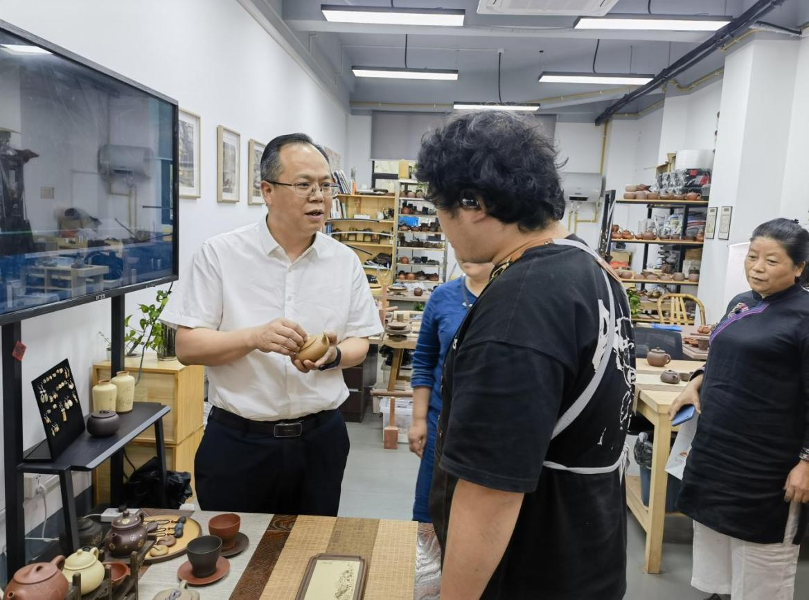 论坛结束后,翁波一行到上海工艺美术职业学院调研,参观该校艺术品博物馆、非遗大师工作室、专业教学实训室等基地,详细了解“3+2”传承人培养、传统工艺创新等工作。