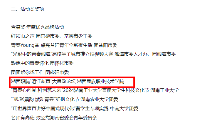 近日,2024年湖南省青媒奖评选结果揭晓,湘西民族职业技术学院“溶江新声”大思政论坛凭借鲜明的品牌特色、丰富的育人实践和广泛的社会影响力,荣获“年度优秀品牌活动”称号。