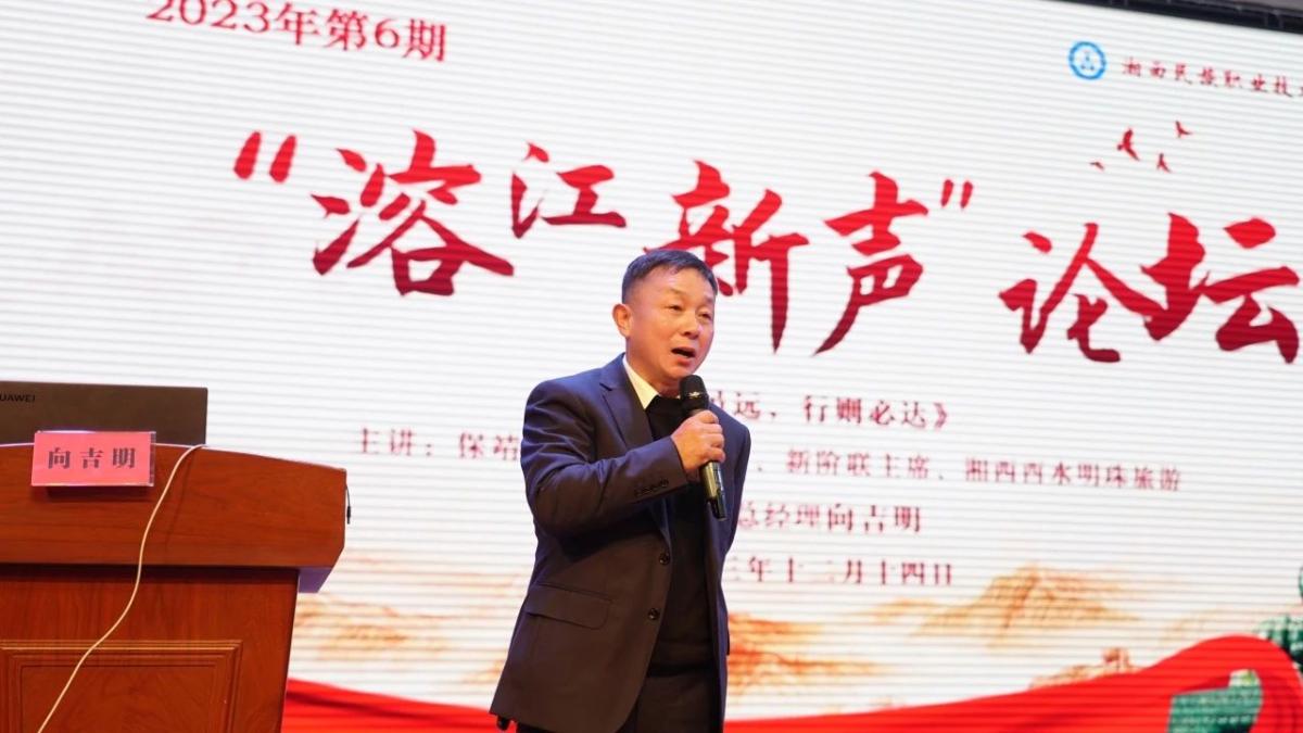“溶江新声”论坛紧扣时代脉搏,立足职教特色,以“大视野、小切口”设计主题。聚焦党政热点,湖南省政府办公厅一级巡视员宁资利剖析“领导干部执行力”、中央团校教授吴庆解读“团学骨干领导力”,助力师生提升政治素养;深耕乡村振兴,花垣县委组织部副部长欧昌银、保靖县企业家向吉明等扎根一线的实践者,以鲜活案例诠释“青春与乡村共成长”;融通专业育人,中山大学郑义教授揭秘“地球科学”、国家特级导游吴巧凌畅谈“文旅融合”,推动思政教育与专业教育同频共振;弘扬榜样力量,全国脱贫攻坚奋进奖获得者谭艳林、湖南省教书育人楷模罗慧玲等先进人物,以奋斗故事点燃学子职业理想;深化文化传承,华南理工大学教授解析“传统村落美学”、吉首大学陈廷亮教授阐释“铸牢中华民族共同体意识”,厚植家国情怀。