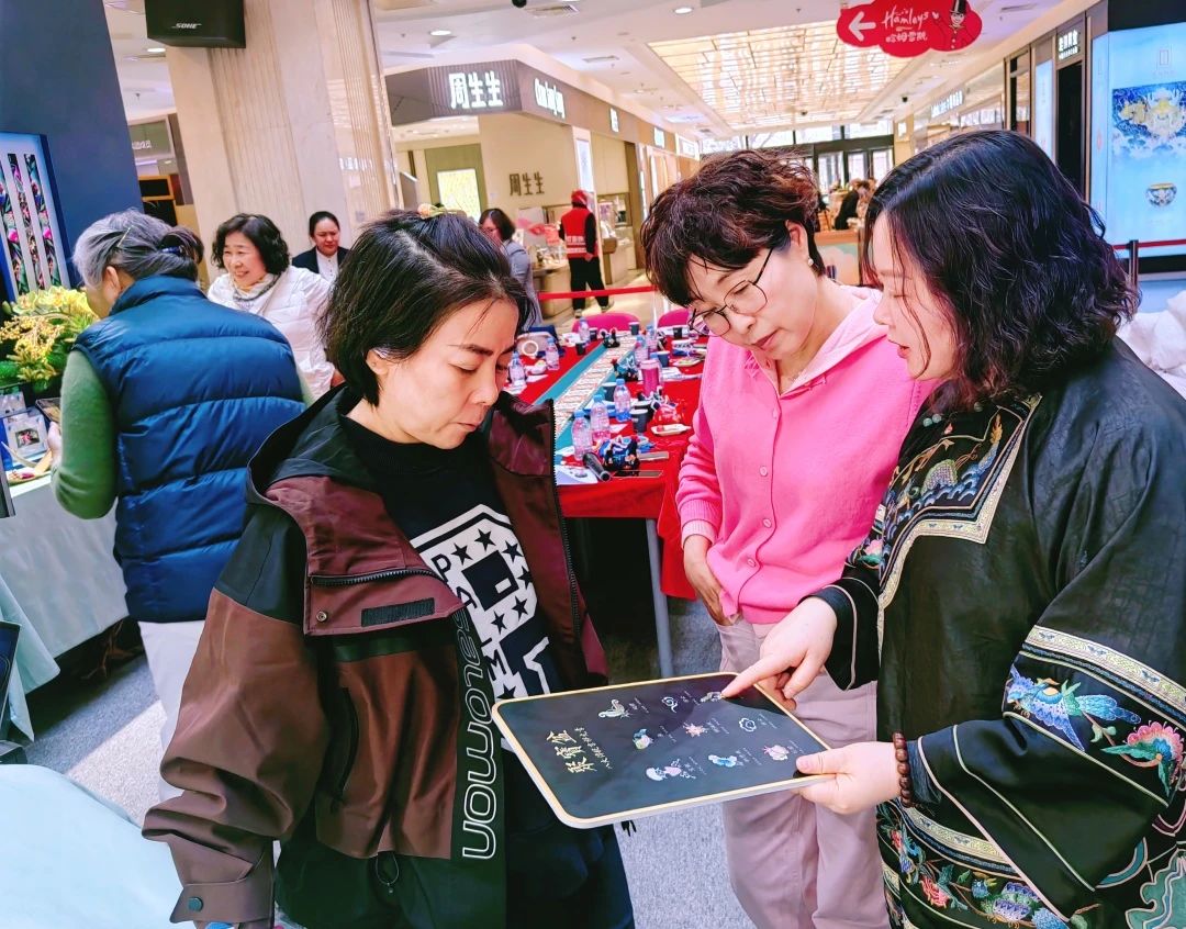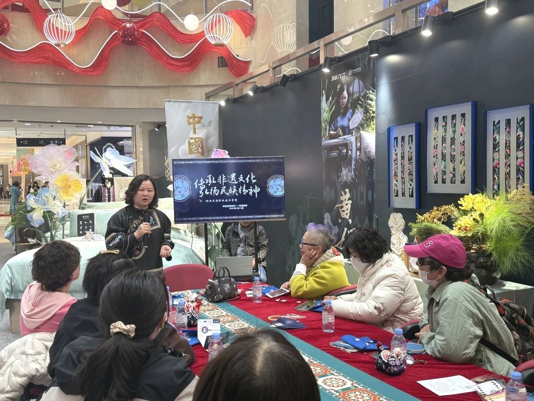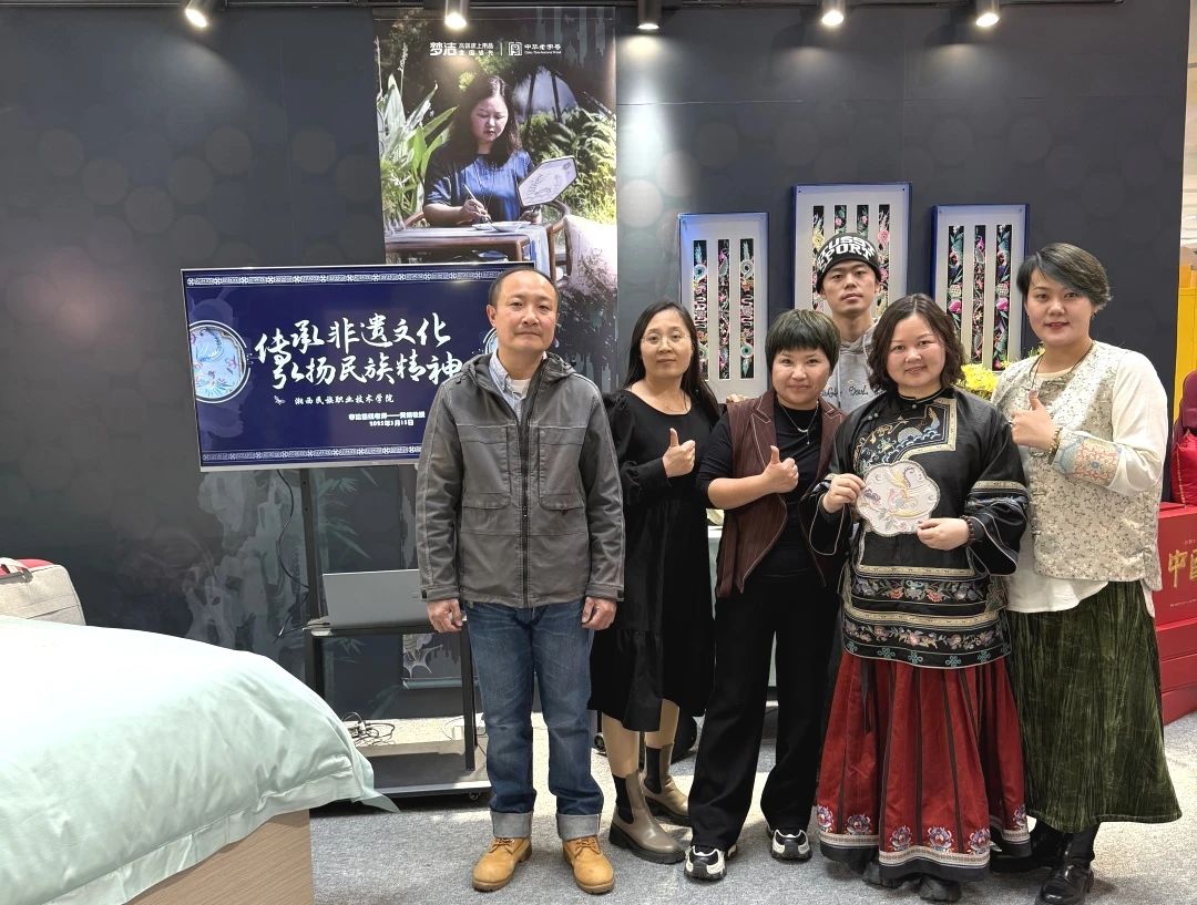 在春意盎然的3月15日,应湖南梦洁睡眠科技有限公司之邀,我校民族艺术学院非遗苗绣名师、工艺美术品专业领军人物黄娟教授,带着湘西苗绣这一民族文化瑰宝,踏入了北京市百货大楼。此次活动以 “非遗技艺进生活” 为主题,旨在将苗绣的深厚历史底蕴与独特艺术魅力全方位地展现给首都市民。