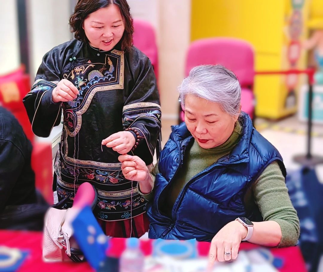 活动现场气氛热闹非凡。黄娟教授以 “苗绣:一针一线绣千年” 为主题展开精彩演讲。她娓娓道来,深入解读苗绣 “以纹载史” 的文化内涵。讲解过程中,黄娟教授演示 “平绣”“插绣”“挑花” 等苗绣绝技,只见她手指灵动,绣针如精灵般在绣布间穿梭,不一会儿,栩栩如生的图案便跃然布上,引得现场观众阵阵惊叹。为了让大家更真切地感受苗绣魅力,黄娟教授还热情邀请观众上台,手把手指导他们体验苗绣针法。一位参与体验的市民兴奋地说:“原本以为苗绣离我们很遥远,亲自上手才知道这里面的学问这么大,太神奇了!”