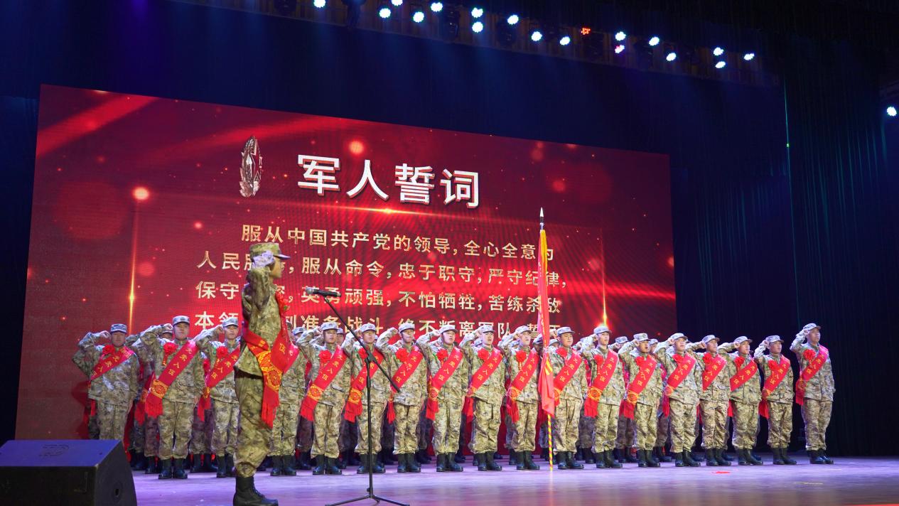 “苦练杀敌本领,时刻准备战斗;绝不叛离军队,誓死保卫祖国!”全体新兵面对旗帜,庄严宣誓。