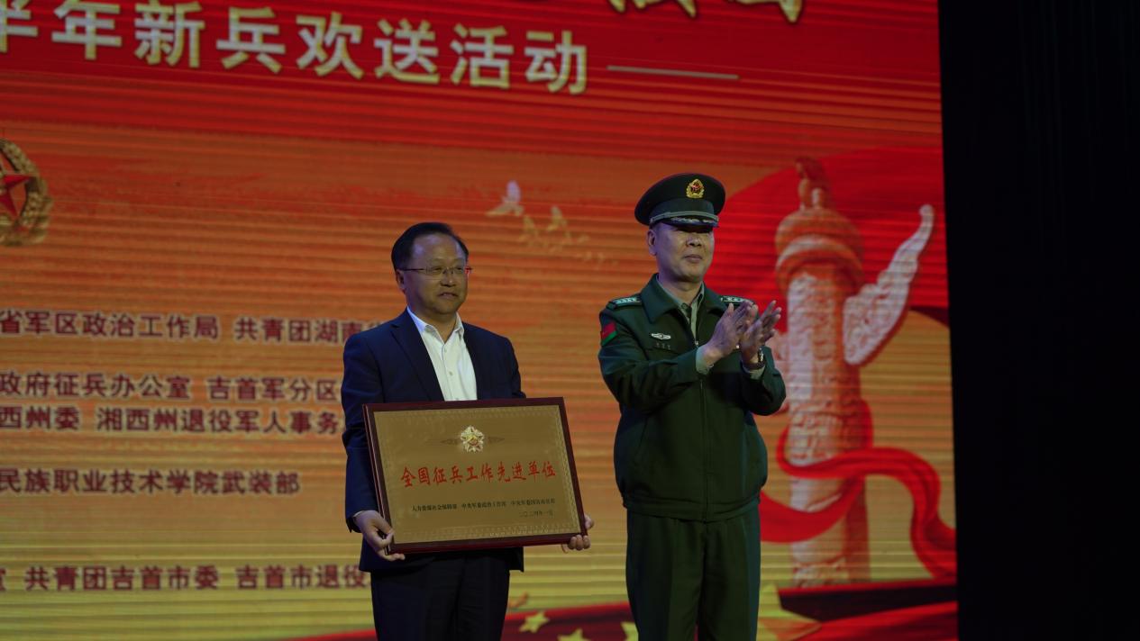 近年来,湘西民族职业技术学院充分发挥高校征兵“主阵地”、兵员“粮仓”作用,5年来向部队输送优秀大学生士兵近700名,2024年1月荣获全国征兵工作先进单位。湖南省军区动员局副局长、省征兵办副主任徐赞军宣读表彰通报并授牌,湘西民族职业技术学院党委书记谢绍猛接牌。