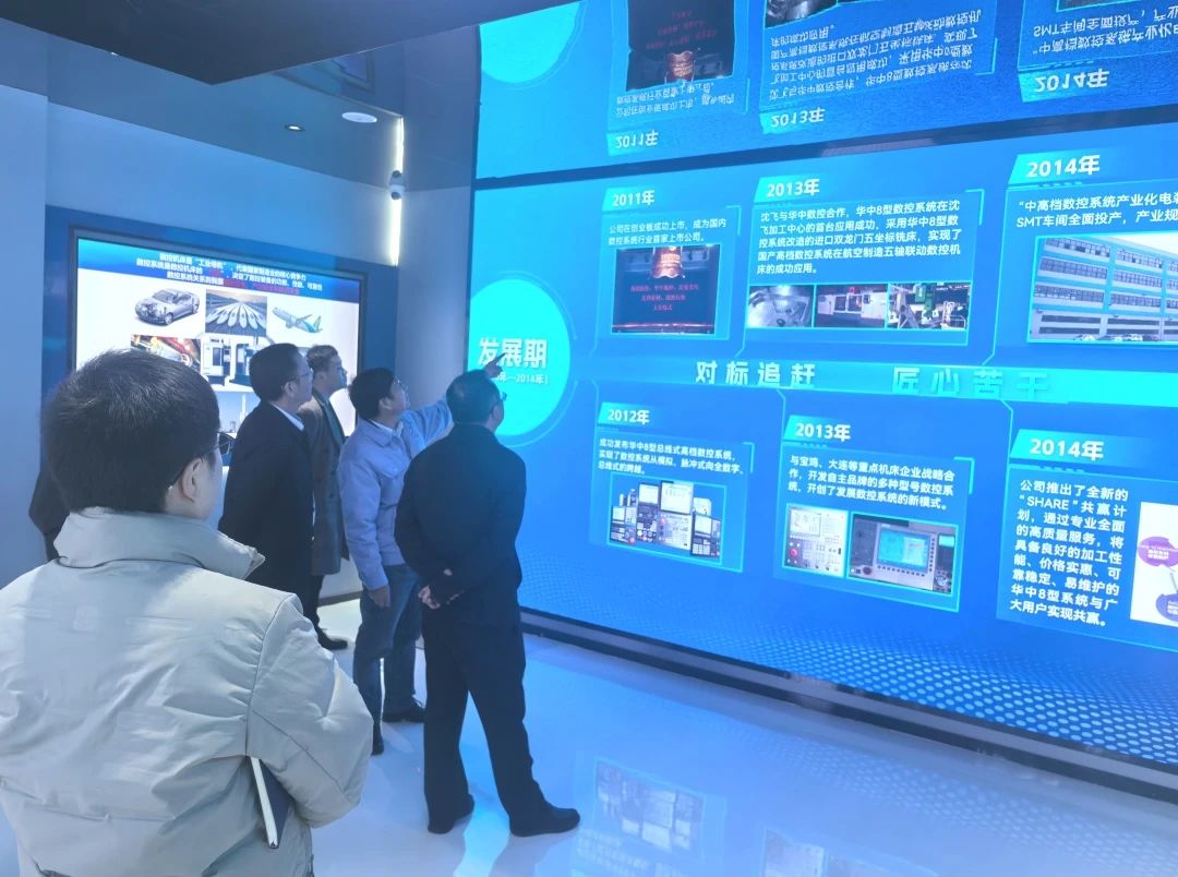 抵达华中数控后,翁波一行在华中数控副总裁、华数学院院长蒋荣良的陪同下,首先参观了企业的研发中心及产品展示区,深入了解了企业在高端装备制造领域的技术创新成果。蒋荣良详细介绍了公司的发展历程、技术创新成果以及未来战略规划。