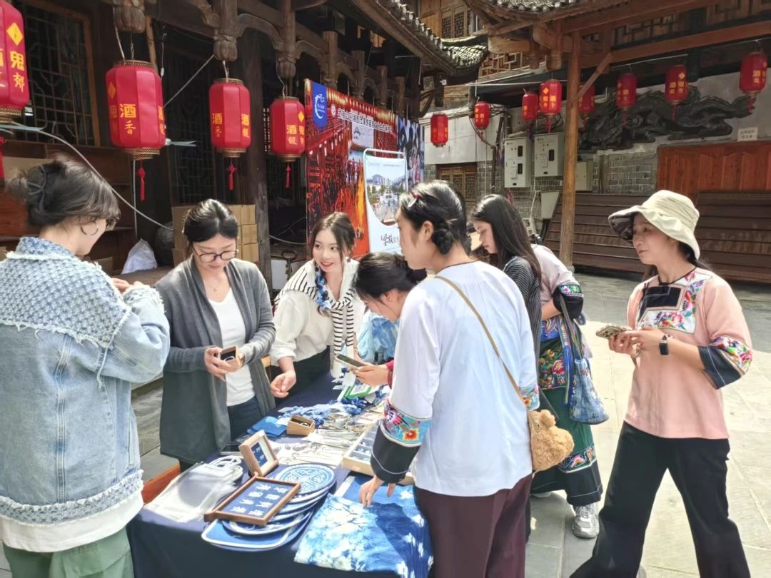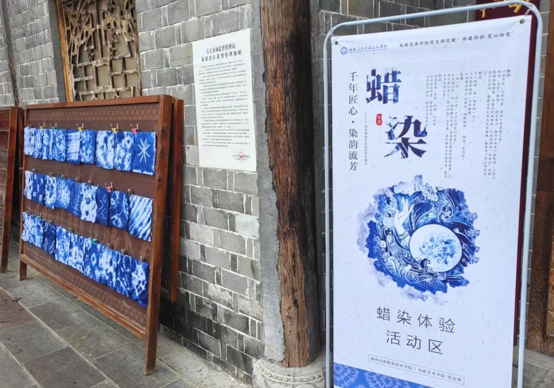 州级非遗传承人彭晓君演绎苗绣绝技,党员教师李燕现场展示扎染技艺,精湛的技艺吸引300余名游客驻足,现场完成蜡染作品200余件,生动展现了非遗技艺在新时代的传承与创新。