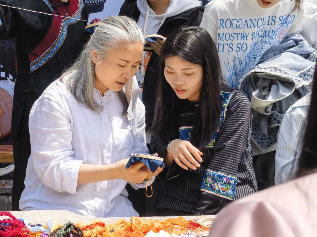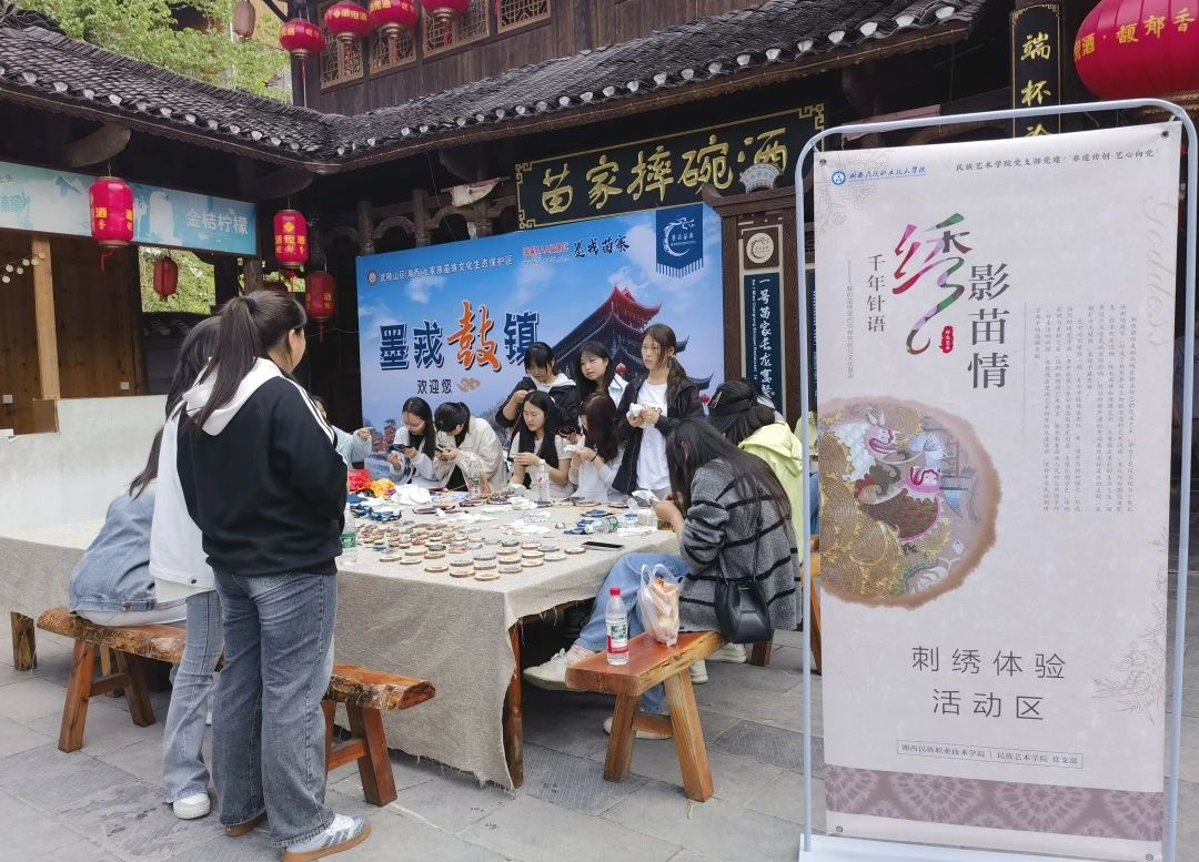 民族艺术学院韩利娜等24名党员教师组建"非遗宣讲团",为现场陈列的200余件苗绣、扎染、蜡染精品撰写"文化标签",细致讲解传统技艺、针法,说好非遗故事。谭霞等5名学生发展对象发挥先锋模范作用,全程保障苗绣体验区活动开展,指导百余名参与者完成"古韵墨戎"主题饰品创作。