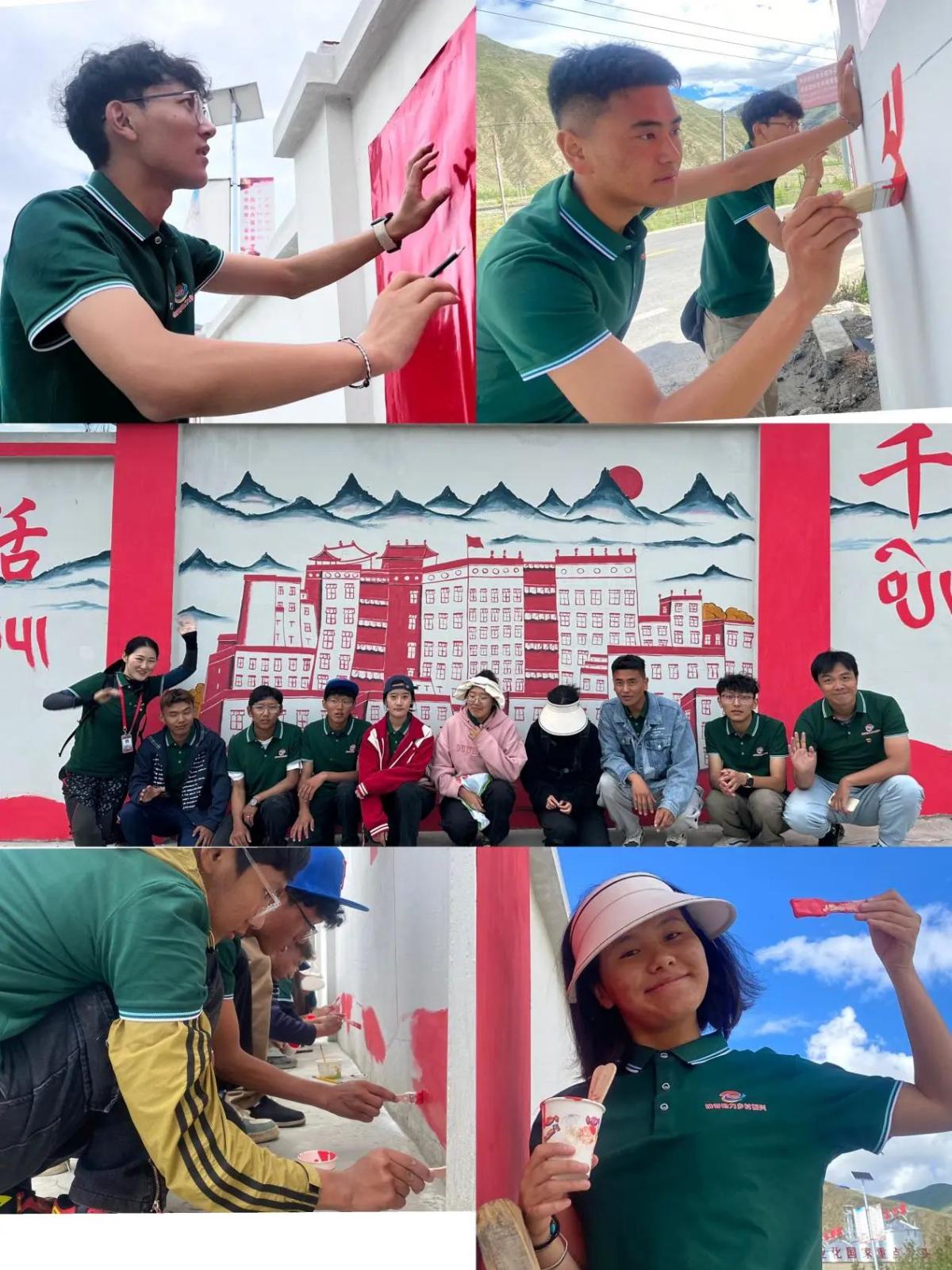 推普期间,团队在养鸡场产业园区入口绘制推普墙绘,队员们团结协作、发挥才能,以墙为布,将藏区风情与推普宣融为一体,通过墙绘“无声语言”展示了格拉村优良的精神风貌,精美的墙绘建立了推普队员与民族地区企业、藏区群众的深厚情谊,推动了乡村文化建设。