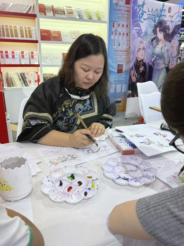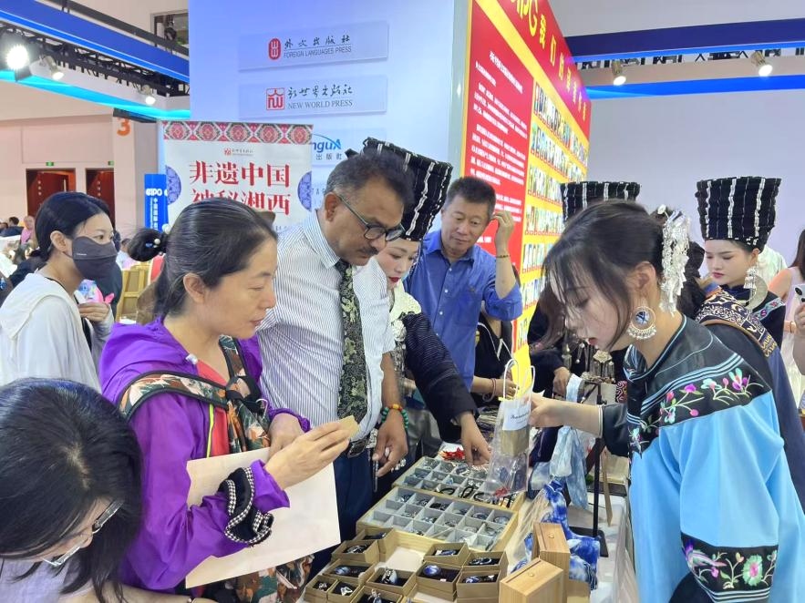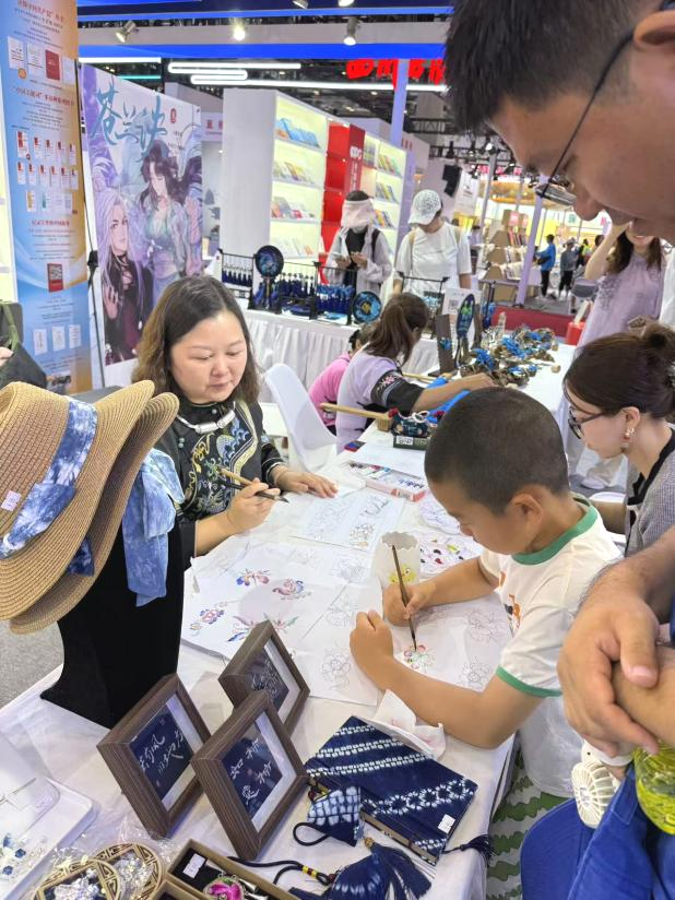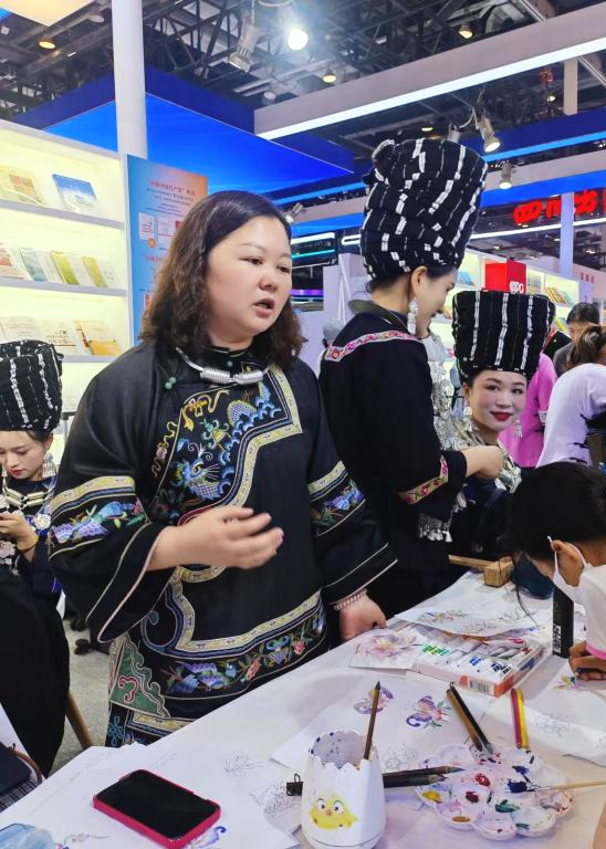 6月21日,第三十一届北京国际图书博览会在北京国际会展中心举办。我校民族艺术学院教师黄娟携手大学生创业代表廖洪婷,应湘西州文化广电新闻出版局特邀,携湘西特色文化成果惊艳亮相。通过现场苗画技艺展示和蓝染文创产品展销,两位师生生动展现了湘西少数民族文化的独特韵味,其展位凭借沉浸式文化体验成为本届展会备受瞩目的文化亮点。