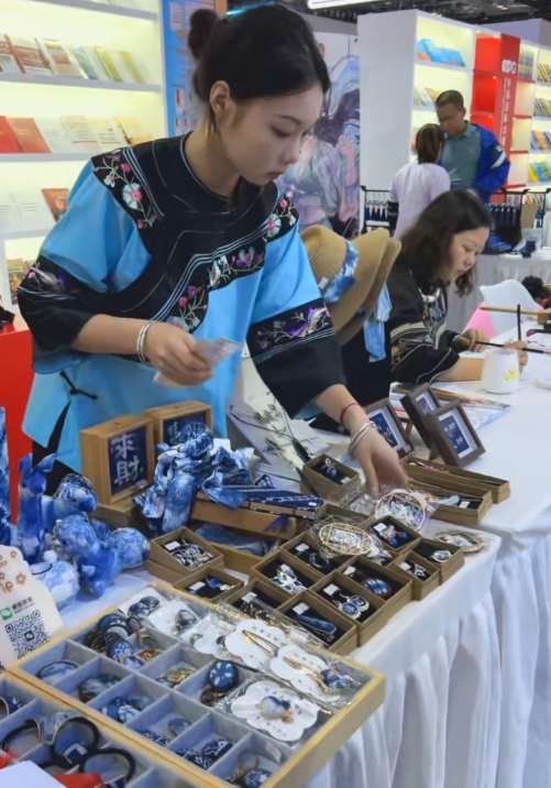 与之相映成趣的是青年创业者廖洪婷的蓝染艺术展区。这位年轻设计师将湘西传承千年的"靛蓝魔法"进行时尚转译,她带来的系列作品涵盖时尚服饰、精美饰品、家居用品等,既保留了蓝染 “青出于蓝” 的古朴质感,又通过剪裁与功能设计赋予其现代实用性,真正实现了"让非遗走进日常生活"的传承理念。
